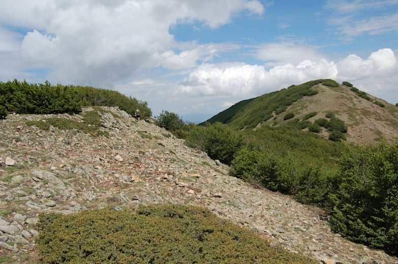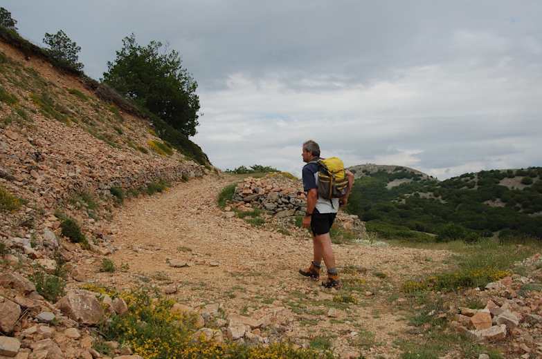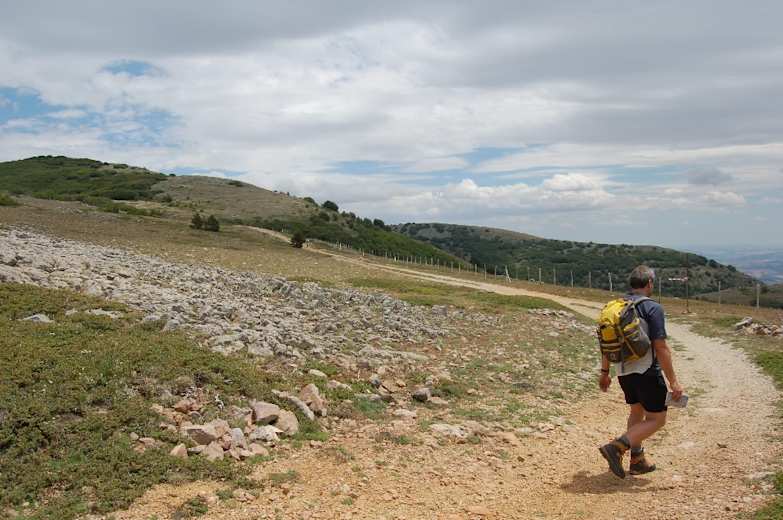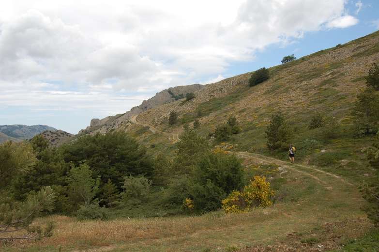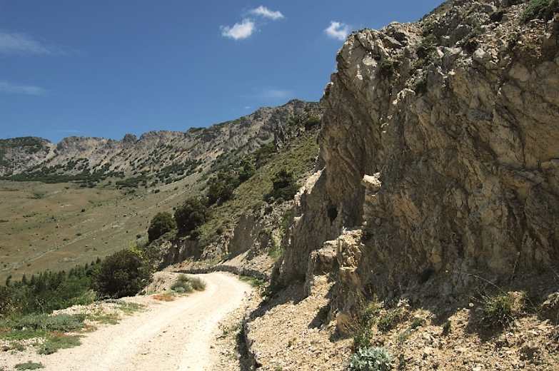 Unser Pfad quert einen mit Kalksteinen übersäten Hang – auch hier rechts oben eine Nebrodi-Tanne – und führt durch einen kleinen Wald. Schließlich kommen wir über Grasmatten mit einem Fahrweg aus einem Wald heraus und wandern auf den offenen Karsthängen über eine flache Hangschulter. An einem Rechtsabzweig geradeaus vorbei treffen wir im Wald wieder auf einen Forstweg.