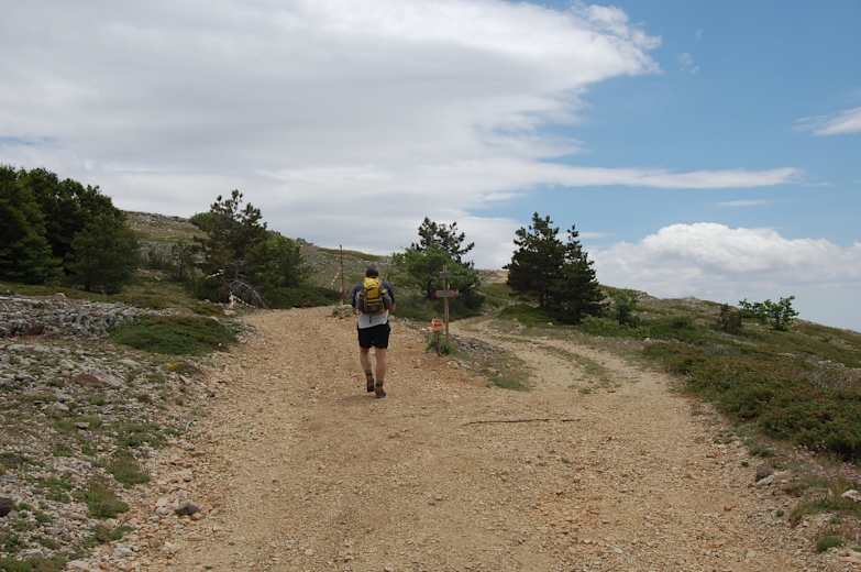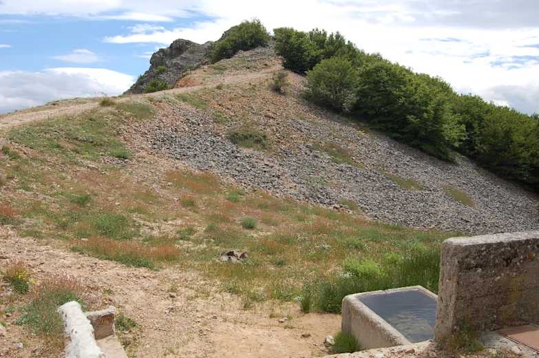 Wir kehren auf gleichem Weg zum Brunnen im Sattel zurück und setzen unsere Wanderung auf dem Forstweg durch die Kettenabsperrung nach links fort. An einer beschilderten Verzweigung gehen wir rechts und nun wieder auf den Piano Grande zu. Wir kommen aus dem Wald heraus und wandern entlang spärlich bewachsener Karsthügel.