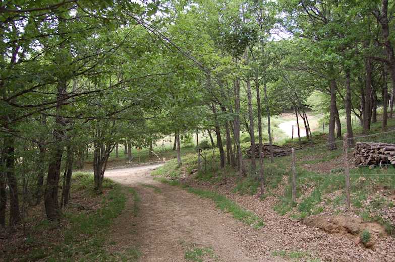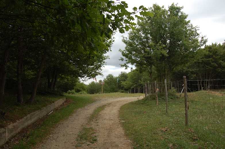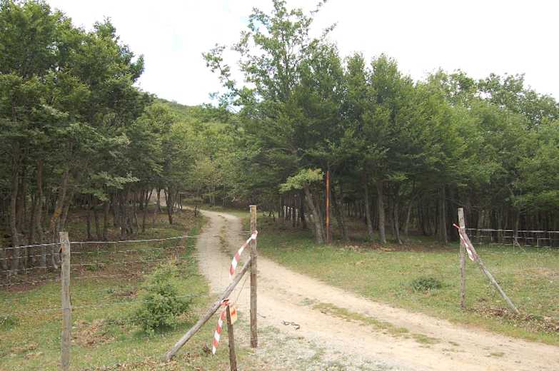 Wieder zurück an der Rechtskehre wandern wir weiter aufwärts, treffen an der Abzweigung mit der Schranke (Piano Grande) auf den Hinweg und gehen hier links. Über den betonbefestigten Forstweg gelangen wir wieder durch den Zaun und schließlich links hinunter bis zum Abzweig unseres Hinweges, auf dem wir von links gekommen sind.
