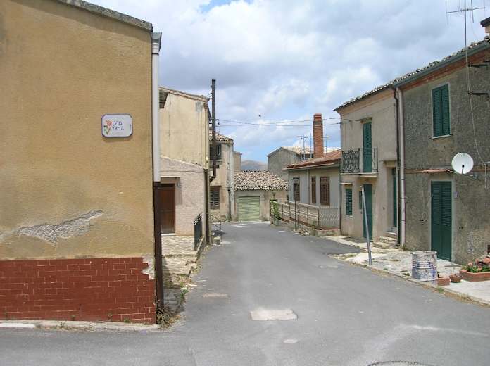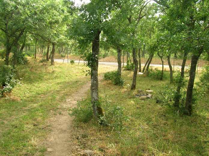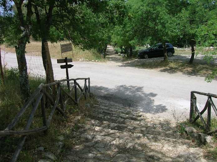 Vor dem Schloss von Ficuzza wenden wir uns nach links auf die Arcaden zu, an einer Pizzeria vorbei bleiben wir auf der Via Diaz bis zu ihrem Ende. Über eine Querstraße halten wir uns geradeaus weiter auf einen Fußweg, der rechts neben einem gelben Haus abwärts beginnt. Wir kommen zu einem ausgedehnten Picknickareal und biegen, begleitet von einem Holzzaun, nach links ab.