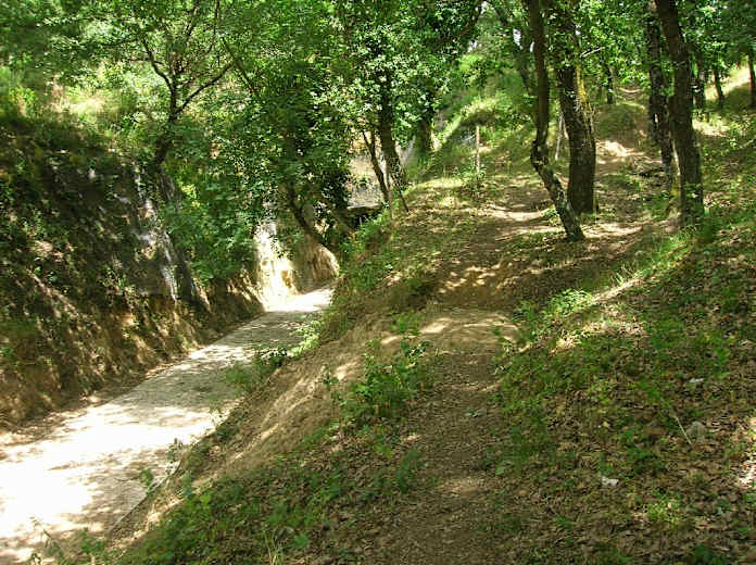 Zwischen einem Zaun zu unserer Linken und dem Bachbett treffen wir nach einiger Zeit auf eine Forststraße (links geht es nach Ficuzza). Wir überqueren nach rechts eine Brücke und verlassen die Forststraße wenig später an einem betonierten Bachdurchlass nach links abwärts auf einen mit grün-weißen Holzpfählen markierten Waldweg, der bald mit groben Steinen gepflastert ist. An einer Viehtränke queren wir das Bachbett nach links.