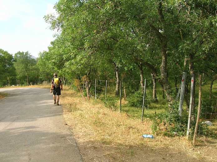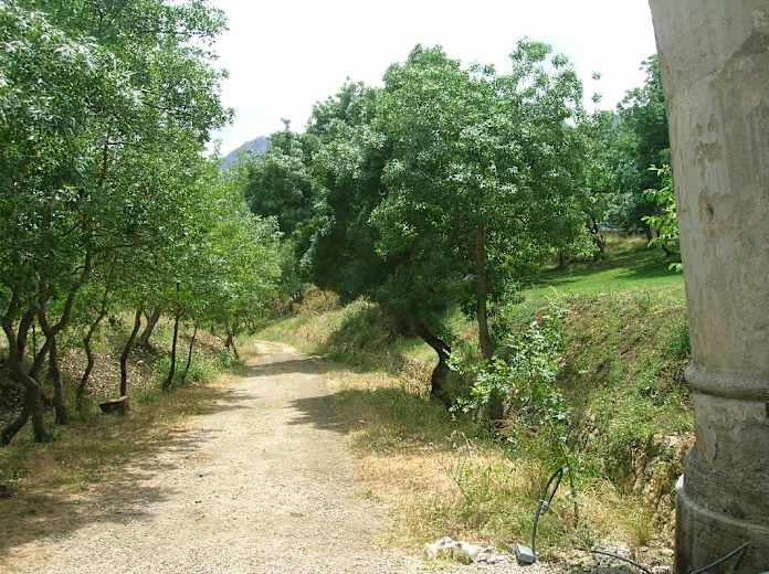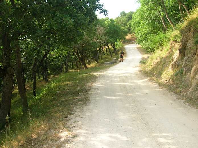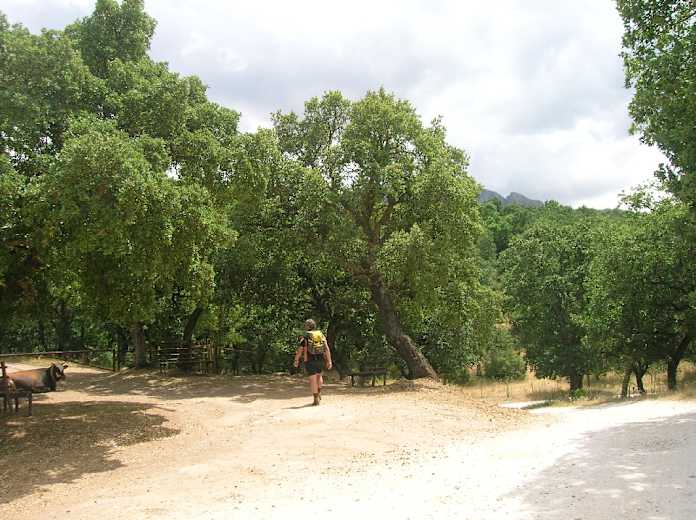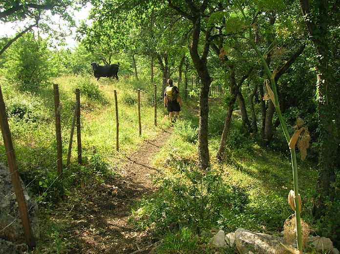 Der hier mit Gras bewachsene Pfad ist anfangs mit einer Reihe von Steinen eingefasst und zuverlässig mit roten Punkten markiert. Immer in Gehrichtung kommen wir nach einer erneuten Bachquerung an einem Viehverschlag vorbei und treffen wenig später auf eine Asphaltstraße, die wir nach rechts einschlagen. Wir verlassen diese Straße vor einer Rechtskehre nach links auf den mit roten Punkten markierten Weg, der sogleich über einen Holzsteg nach rechts durch ein Picknickgelände, 693 m, führt. So erreichen wir vor den ersten Häusern von Ficuzza ein Sträßlein, mit dem wir nach rechts an einer kleinen Kapelle vorbei in den Ort gelangen. Dem Straßenverlauf folgend kommen wir wieder an den Schlossplatz und durch die Arkaden nach rechts zu unserem Ausgangspunkt.