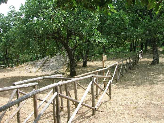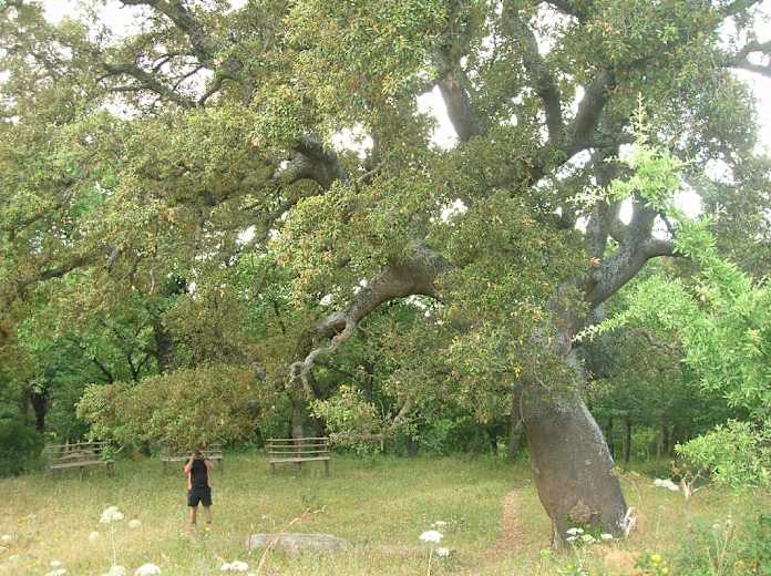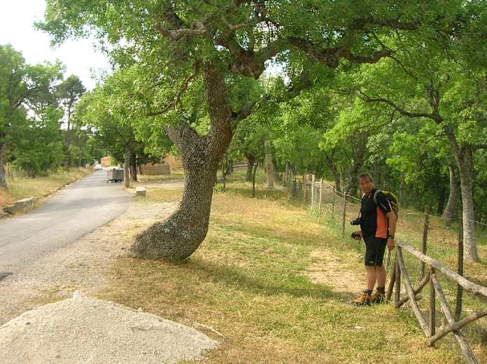 Vom Abstecher zurück durchschreiten wir das Holztor nach links und folgen weiter dem Pfad. In einem Bachbett kommen wir an einen beschilderten Wegeabzweig. Hier unternehmen wir einen weiteren Abstecher nach links Richtung Querce secolari und folgen dem Bachlauf auf seiner linken Seite aufwärts. Immer geradeaus erreichen wir bald einen riesigen Baum, bei dem einige Holzbänke aufgestellt sind. Wer möchte, kann hier noch weiter auf dem Pfad geradeaus zu einigen in der Wiese eingebetteten Seen gehen.