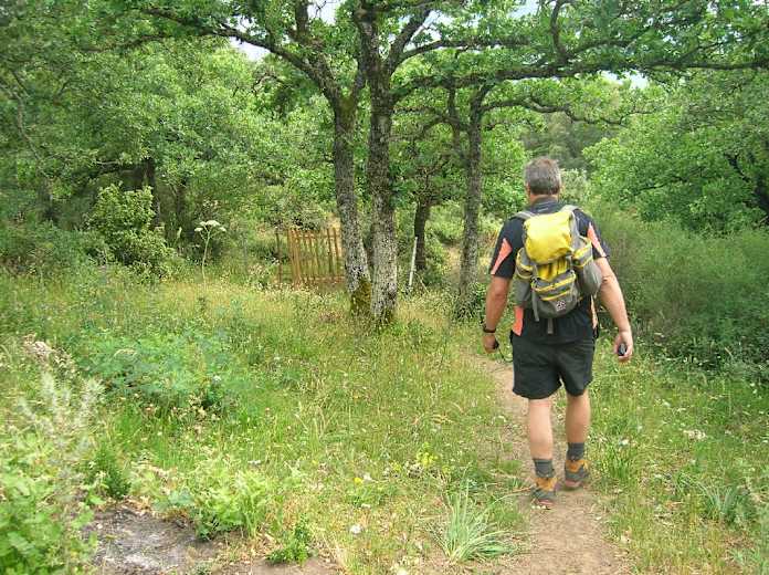 Auf dem gleichen Weg kehren wir an dem großen Baum vorbei zu dem Abzweig im Bachbett zurück. Wir wenden uns nun kurz nach links und gehen noch vor dem Zaun gleich wieder rechts auf der linken Seite eines im Sommer trockengefallenen Bachbettes abwärts. Rote Markierungen weisen uns den Weg.