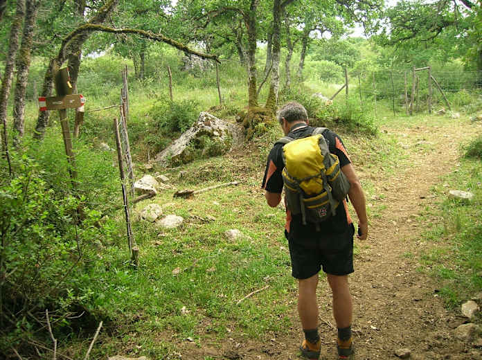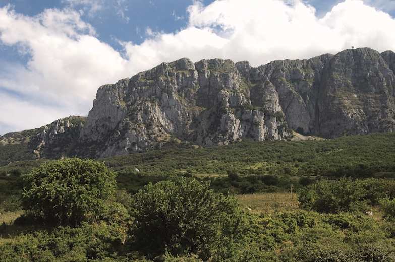 Der Pfad windet sich nach rechts auf einem Grat im Wald entlang. Mit Blick auf die Felswände der Rocca Busambra steigen wir in eine Senke hinunter, in der wir zu einem Holzgatter kommen. Hier kann man nach links weglos zu einer den Wald nur knapp überragenden Felskuppe Pizzo Castrateria, 884 m, aufsteigen und von dort einen grandiosen Rundblick über das Waldgebiet genießen.