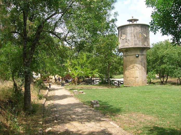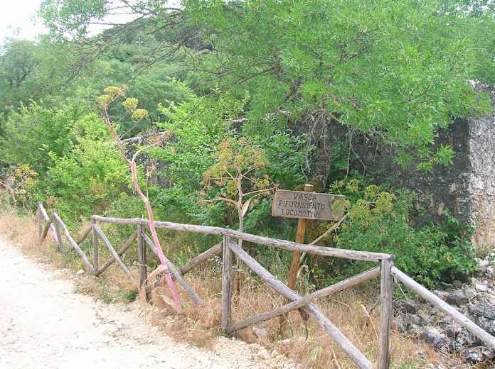 Immer am Zaun entlang überqueren wir nach einem Linksbogen bald die Straße und kommen zur alten Bahnstation von Ficuzza, die heute das Restaurant Antica Stazione beherbergt. Vor dem Gebäude kurz rechts gelangen wir um den alten Wasserturm herum wieder nach rechts auf die alte Bahntrasse (rot-weiße Markierung). Auf dieser Trasse bleiben wir nun eine ganze Weile und kommen zunächst am Vasca Rifornimento Locomotive, einem großen Wasserauffangbehälter, vorbei.