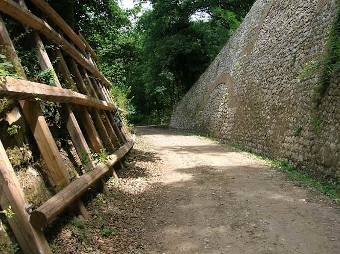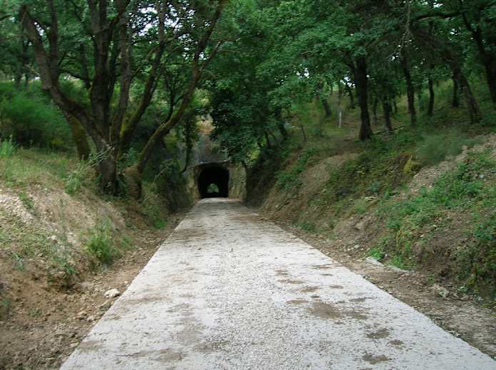 Wir wandern über ein Tunnelportal mit herrlichem Blick nach links über das ausgedehnte Waldgebiet und darin eingebettet Ficuzza. An einer gemauerten Hangsicherung vorbei führt uns die Bahntrasse weiter durch den Wald, bis sie in einem Tunnel verschwindet. Kurz vor dem Tunneleingang verlassen wir die Bahntrasse und steigen nach rechts mit einem schmalen Pfad entlang eines Zaunes zu einer Straße hinauf.