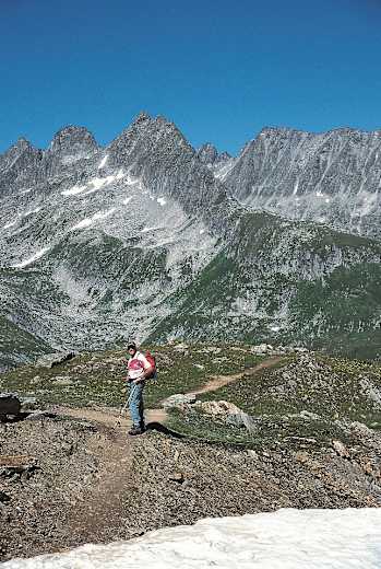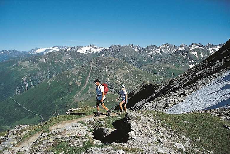 Der stellenweise ausgesetzte Saumpfad windet sich oberhalb der Seeplanggenflüe (2.572 m) im Zickzack zur Militärbaracke unterhalb des Pazolastock, 2.740 m, hinauf. Zwei Minuten darauf schlagen wir an der Steinsäule auf dem Gipfel an und genießen das Rundumpanorama. Sedrun liegt wie eine Spielzeugstadt unter uns, bei guter Sicht lässt sich das Vorderrheintal bis Chur überblicken.