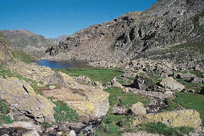 Wir steigen nun unterhalb des felsigen Grates des Fil Tuma zur Badushütte, 2.503 m, ab. Auf der Terrasse lässt es sich bei einer Flasche Rivella genüsslich rasten. Von der Berghütte führen zwei Routen zum See. Wir wählen die schönere und ein paar Minuten längere Variante, die von der Hütte rechts bergab an großen Steinmännchen vorbei durch grüne Matten in ein sumpfiges Kerbtal läuft. In der Talsohle gehen wir am Bach entlang, queren diesen und blicken dann auf den von bizarren Felsblöcken umgebenen, Lai da Tuma, 2.343 m, den Quellsee des Vorderrheins.