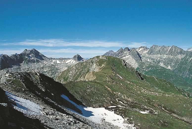 Zurück an der Hütte läuft der Pfad zunächst auf dem Südgrat ein kurzes Stück abwärts, um dann im Gegenanstieg nochmals steil anzusteigen. Die Passage sieht schwieriger aus, als sie ist, und kann überraschend einfach gemeistert werden. Vom Grat genießen wir fulminante Aussichten nach hüben und drüben – zur Rechten auf Andermatt und Furka, zur Linken in die Surselva. 20 Minuten nach dem Pazolastock wird der Gratkopf (2.743 m) erreicht – höher geht es heute nicht mehr.