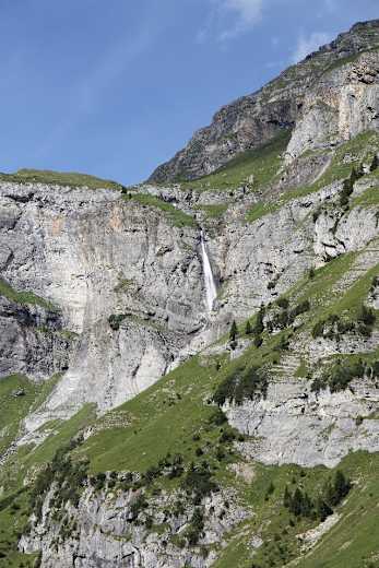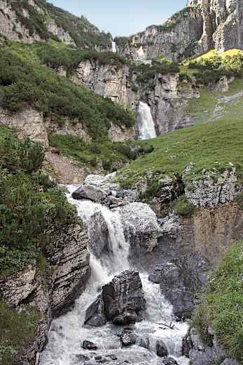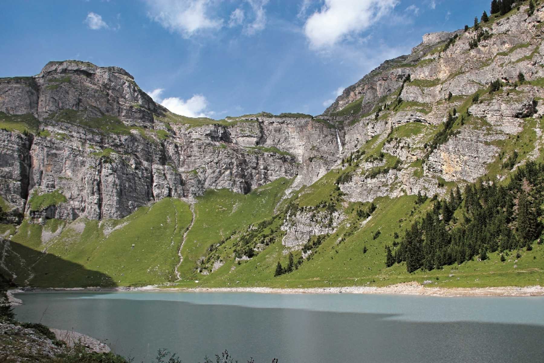 Zu den Wasserfällen am Panixer Stausee (1.453 m) im Schweizer Kanton Graubünden: Wie ein Amphitheater türmen sich die Felswände um den kleinen Stausee von Panix, der von den Wassermassen aus dem Gletschervorfeld des 3.158 Meter hohen Hausstock gespeist wird. Zwei imposante Wasserfälle stürzen in mehreren Kaskaden den Fels hinab. Der Wanderweg zum See führt durch die Glarner Alpen und das reizvolle Flusstal der Schmuer.