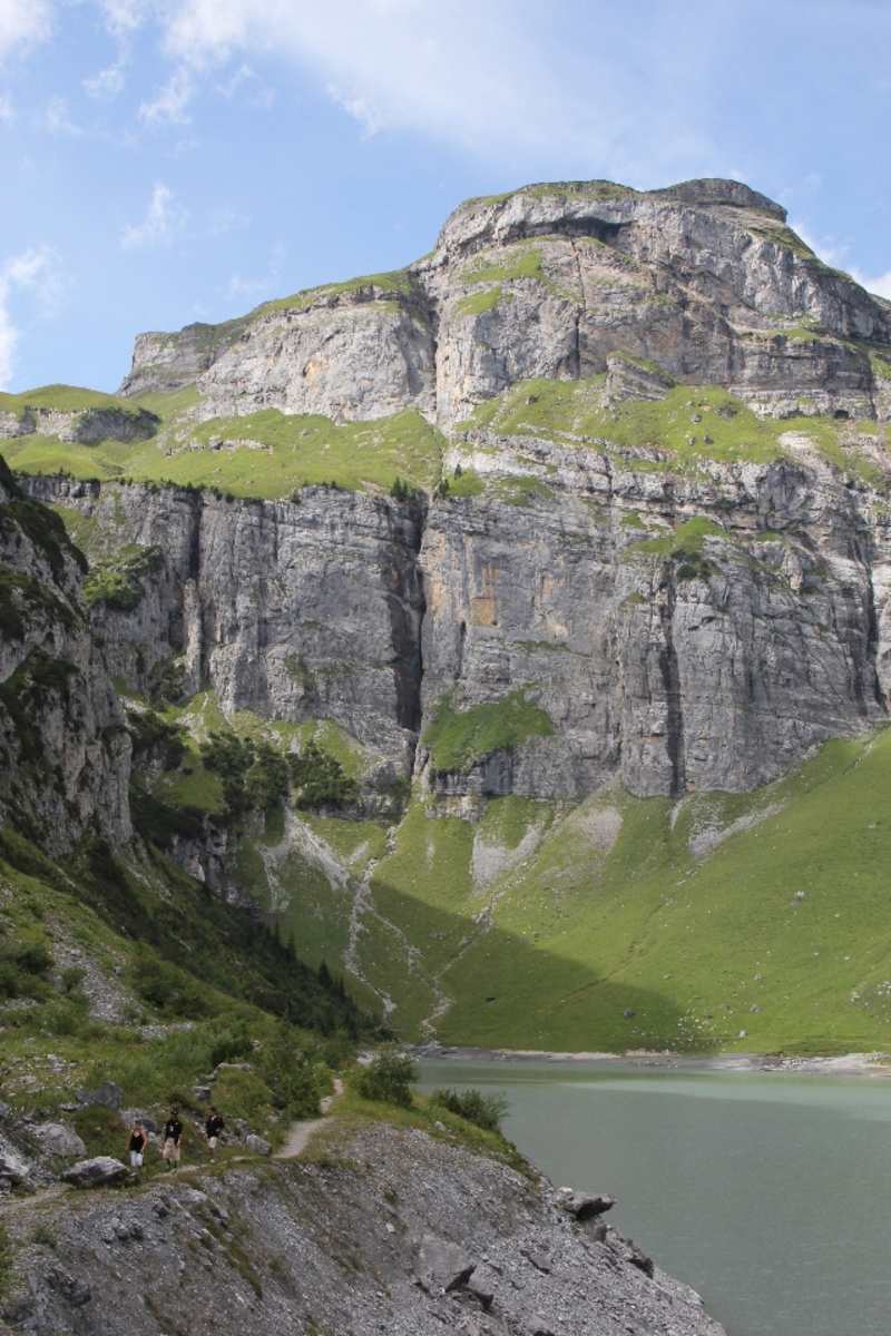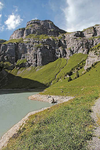 Der Almweg wechselt ansteigend in zwei langen Schleifen zur anderen Talseite und mündet dort in eine schmale Teerstraße. Dieser folgen wir links, bald zeigen sich die Staumauer und dahinter der massige Gipfel des Hausstock. An einem Parkplatz vor dem Damm schwenkt das Sträßchen nach rechts aufwärts, wir verlassen es hier geradeaus in einen Wiesenpfad, der uns an einem Brunnen vorbei zum östlichen Rand der Staumauer des Lag da Pigniu, 1.452 m, bringt.
