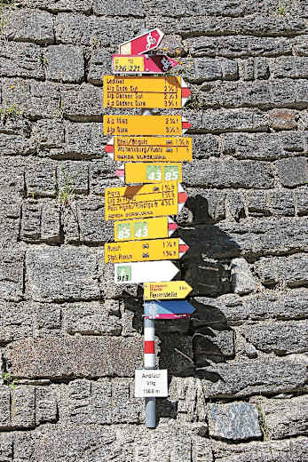 Einkehren kann man im Restaurant Postigliun mit viel gelobter Regionalküche (Carnugl, oberhalb der Andiaster Hauptstraße).