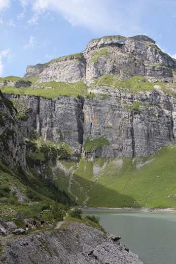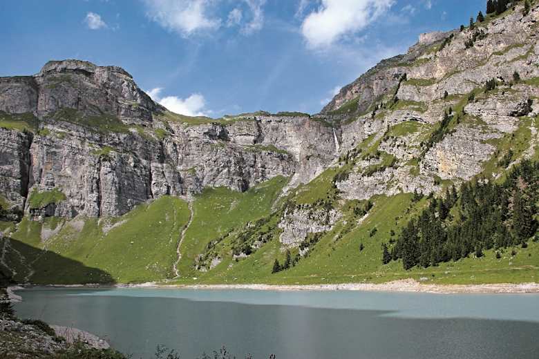 Je nach Gusto können wir nun zunächst auf der 270 m langen Staumauer entlangschlendern oder sogleich am Südostufer mit der Umrundung des Sees beginnen. Die beiden Wasserfälle, 1.452 m, stürzen im hinteren Teil des Sees in etlichen Kaskaden mehr als 300 m hohe Wände hinab, der größere davon in der nordwestlichsten Ecke.