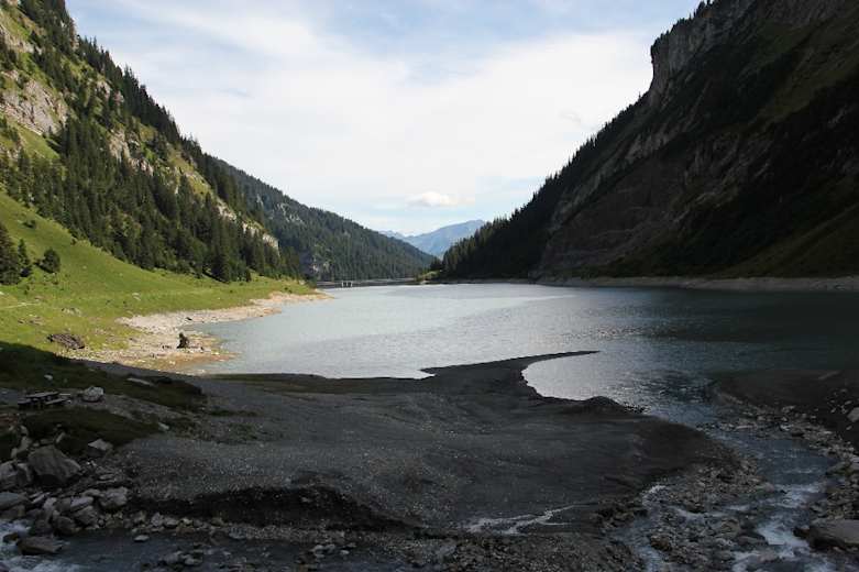 Ein paar Minuten darauf kommen wir an zwei kurz hintereinanderliegenden Feuerstellen vorbei, die erste heißt Plain Asch, 1.275 m, und verfügt auch über einen kleinen Spielplatz. Kurz nach der zweiten Feuerstelle haben wir die Wahl: Links kann auf einem ziemlich steilen Pfad direkt zum Stausee aufgestiegen werden. Sofern wir den bequemeren Aufstieg wählen, folgen wir dem Almweg weiter geradeaus und queren 5 Minuten später auf der Schmuerbachbrücke, 1.284 m, den Fluss.