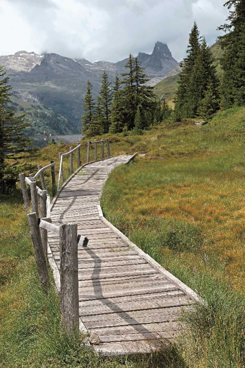 Einkehren kann man im Restaurant Ganni in Leis (Tel. +41/81 9351354, www.ganni.ch) und im Restaurant Zerfreila (Tel. +41/81 9351166, www.zerveila. ch) – Spezialität ist der Heidelbeerkuchen.