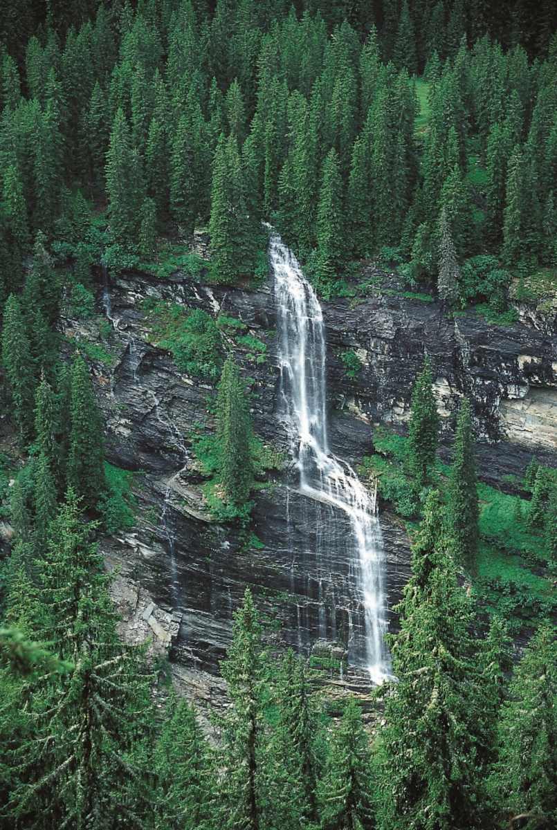 Wieder zurück an der Gabelung steigen wir weiter durch den Wald Richtung Vals ab. Der Hang fällt stellenweise fast senkrecht ab, der Weg ist steinig und etwas mühsam zu gehen. Nachdem wir eine Forststraße und zweimal die Zerfreilastraße gekreuzt haben, erreichen wir nahe der Talstation der Bergbahn den Ortseingang von Valé, 1.266 m. Wir folgen der Straße 5 Minuten, bis diese Richtung Ilanz links abknickt, und gehen dann geradeaus in Richtung Hotel Valserhof zur Kirche in Vals Platz und über die Brücke zurück zur Post.