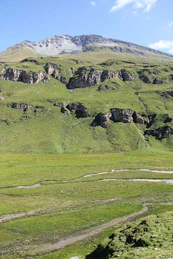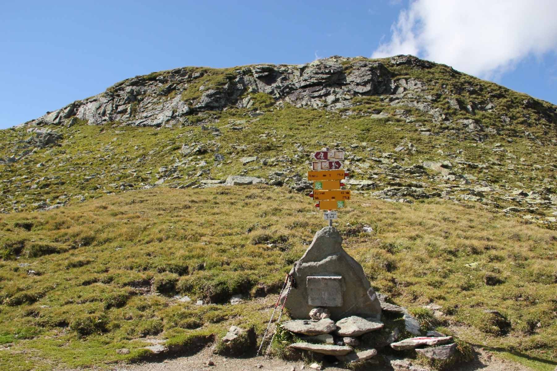Südlich des lang gestreckten Gipfelgrates des Tomülhorn wird nach mäßig steilem Anstieg der Tomülpass, 2.412 m, erreicht. Vom Pass umlaufen wir in Blickrichtung zu dem von hier nicht einsehbaren Tomülhorn zunächst mehr oder weniger weglos die felsige Kuppe über dem Standortschild und halten dann auf einen Strommast zu, an dem ein erodierter Pfad Konturen annimmt.