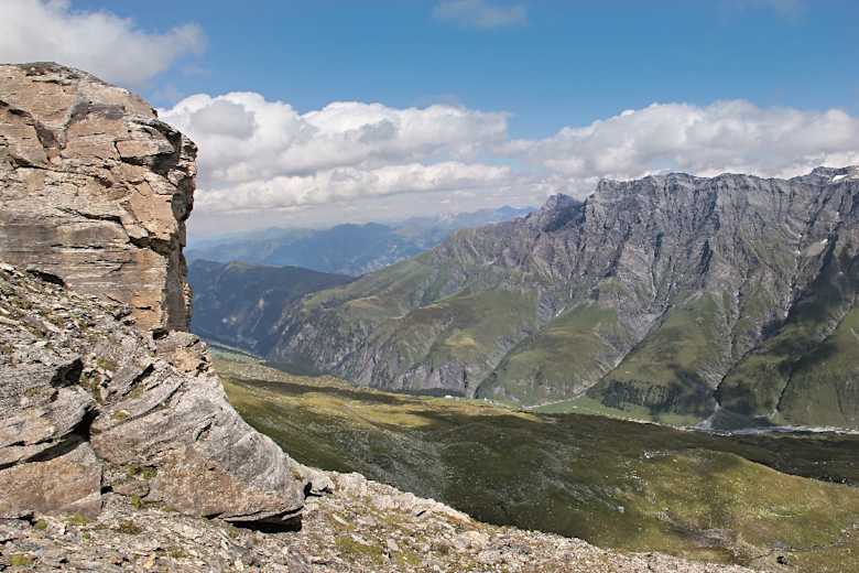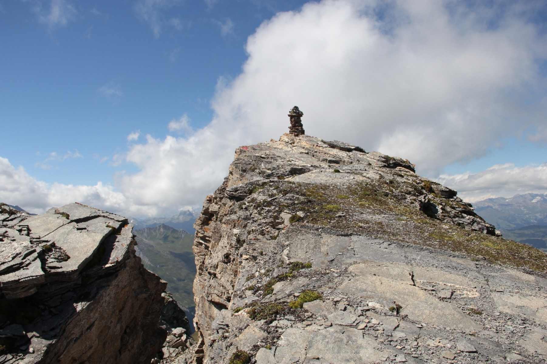 Auf dem zunächst breiten Grat angekommen ist der Pfad nun eindeutig und wird immer besser. Von dem imposanten Gratweg genießen wir linker Hand wunderbare Ausblicke ins Valsertal und den Zerfreilasee, rechts schauen wir ins Safiental hinab. Im felsigen Schuttbereich (Punkt 2834, 7) unterhalb des Gipfels verlassen wir den Grat, leicht nach rechts setzt sich hier die deutliche Trittspur vor. Etwa 20 Minuten darauf stehen wir nach nochmals steilem Anstieg am großen Steinmann auf dem Tomülhorn, 2.946 m. Vorsicht, neben dem Steinmann am Gipfel ist nur wenig Platz, der Fels fällt jäh zu drei Seiten ab. Besonders eindrucksvoll zeigt sich im Südwesten oberhalb des Zerfreilasees das Rheinwaldhorn mit dem Läntagletscher, gegen Osten dominieren die Splügener Kalkberge mit dem markanten Klotz der Grauhörner.