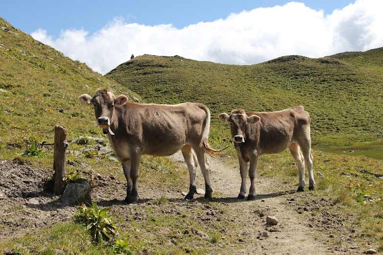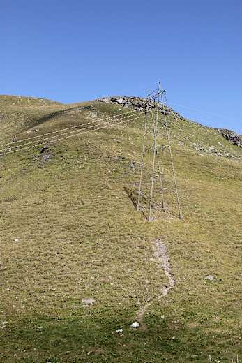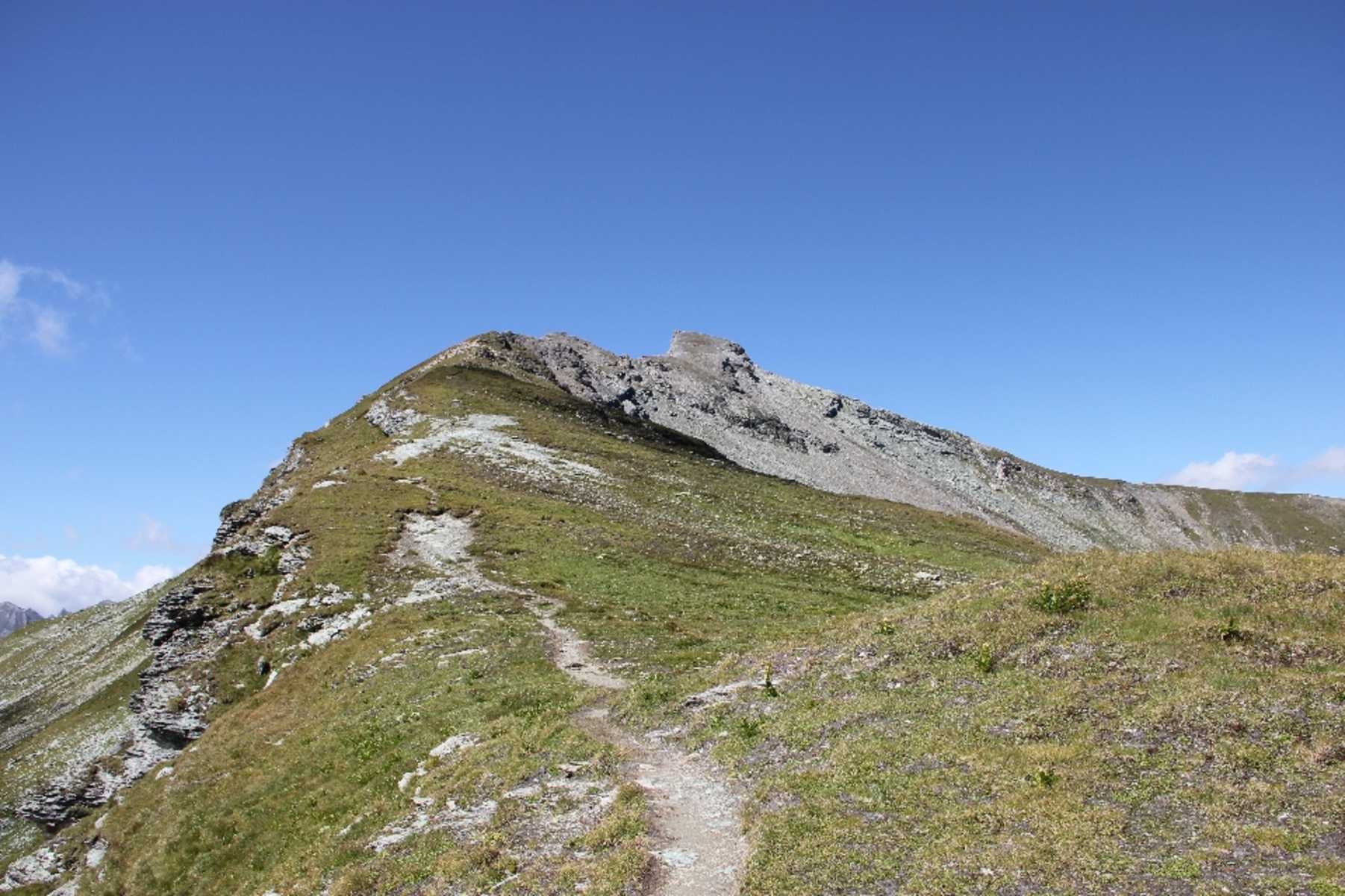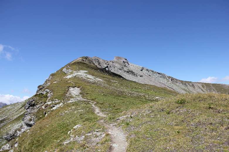 Die vage Trittspur läuft steil etwa 10 bis 15 Meter links von einem Weidezaun zu einer weiteren mit Felsen besetzten Kuppe (Punkt 2535, 6) hinauf und passiert diese auf der linken Seite. Nach der zweiten Kuppe folgen wir noch etwa 150 m dem Weidezaun und achten dann auf eine rechts auf den breiten Grat hinaufziehende Trittspur (Steinmännchen).