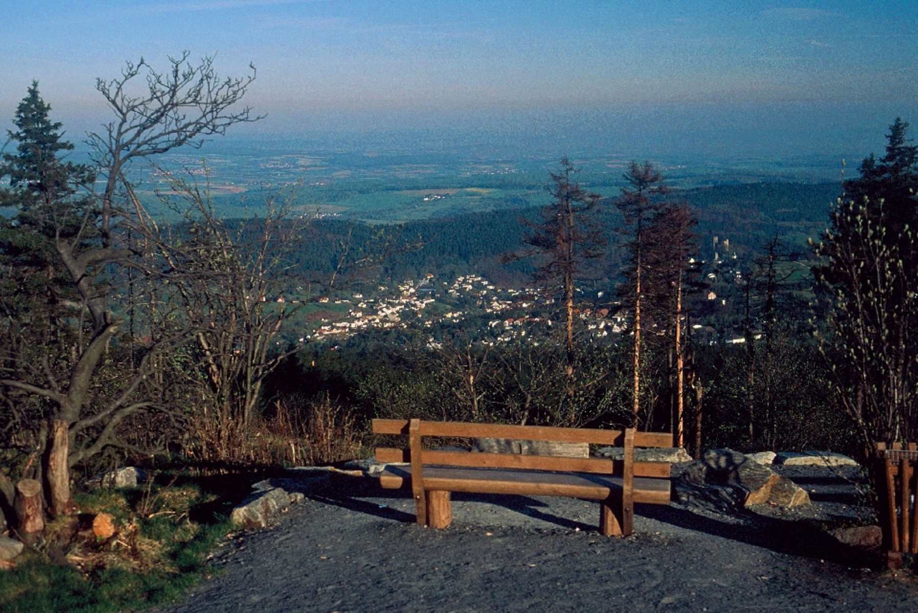 Vom Fuße des Bergfrieds schweift der Blick hinüber zum türmegespickten Feldberg. Zurück an der Kirche senkt sich schwarzer Punkt hinab nach Niederreifenberg, verlässt den Ortsteil links zum Friedhof und kreuzt im weiteren Anstieg die ehemalige Handelsroute Hühnerstraße. Bald zeigt rechts ein Wegweiser abwärts zum Großen Zacken. Diese mächtige Quarzitklippe bildete der Legende zufolge den bevorzugten Aussichtsplatz des Räuberhauptmanns Schinderhannes.