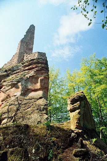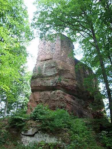 Dort geht es links zum Parkplatz An der Schanze, wo ein Waldweg zu den Ruinen der Felsenburg Blumenstein hinaufleitet – eine Raststelle mit hervorragender Aussicht. Die Beschilderung „Opferschale" führt zum Maimont, einer ringumwallten Höhe mit einem Schalenfelsen im Buchenhochwald sowie einer Kriegsgedenkstätte an der deutsch-französischen Grenze.
