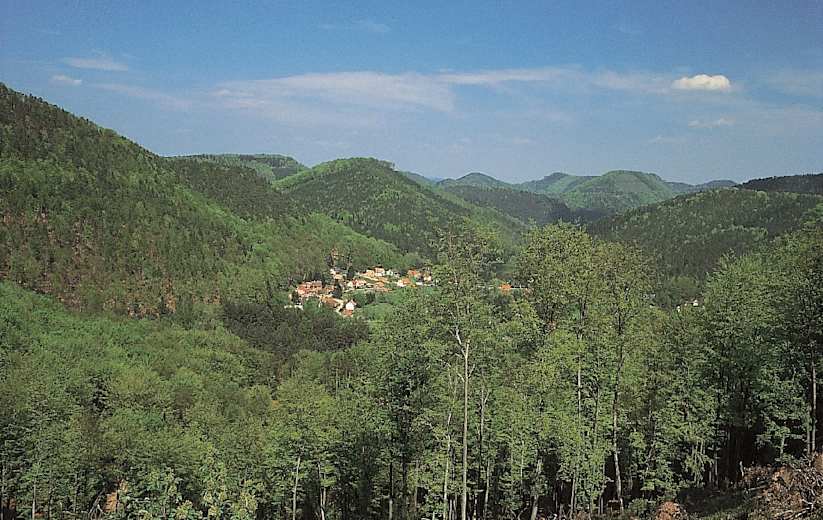 Wanderung zu den Felsenburgen in den Nordvogesen in der Pfalz in Deutschland: Den Erholungsort Schönau im Dahner Felsenland an der Grenze zu Frankreich umgeben einige der berühmtesten Felsenburgen des Wasgenwaldes und der nördlichen Vogesen.