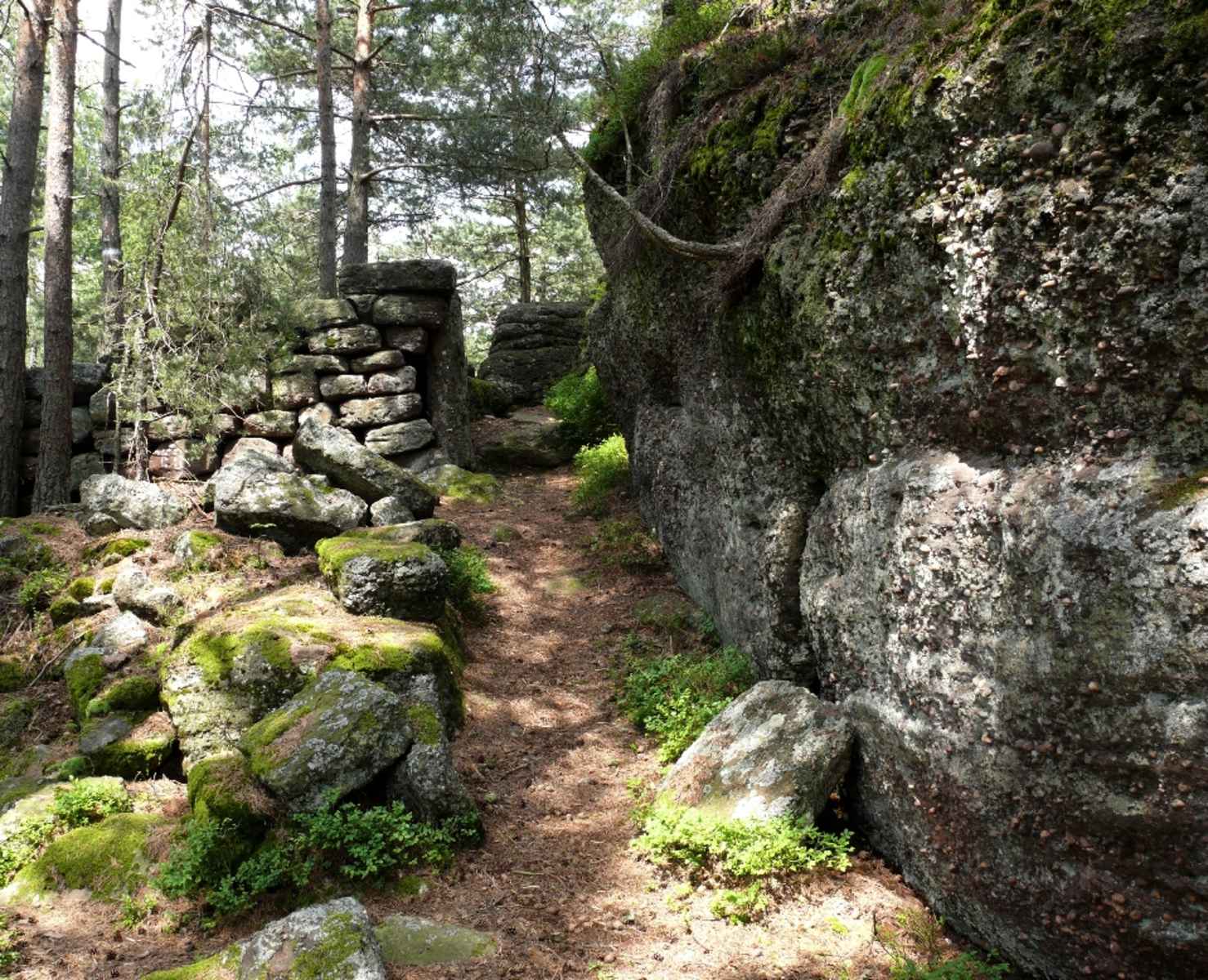 Hier beginnt der nördliche Heidenmauer-Rundweg. Er passiert im Wald den als vorgeschichtlicher Steinbruch genutzten Forrerfelsen und gleich darauf den Rocher Saint-Nicolas/ Nikolausfelsen am Felsentor. Im weiteren Verlauf ist die Heidenmauer zum Teil verschwunden, weil die Steine zum Bau der unterhalb gelegenen Burg Dreistein (Ruine) verwendet wurden.
