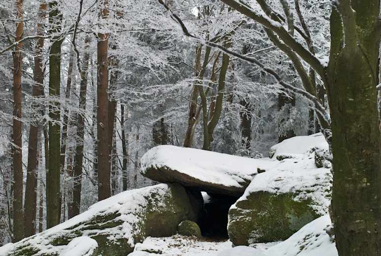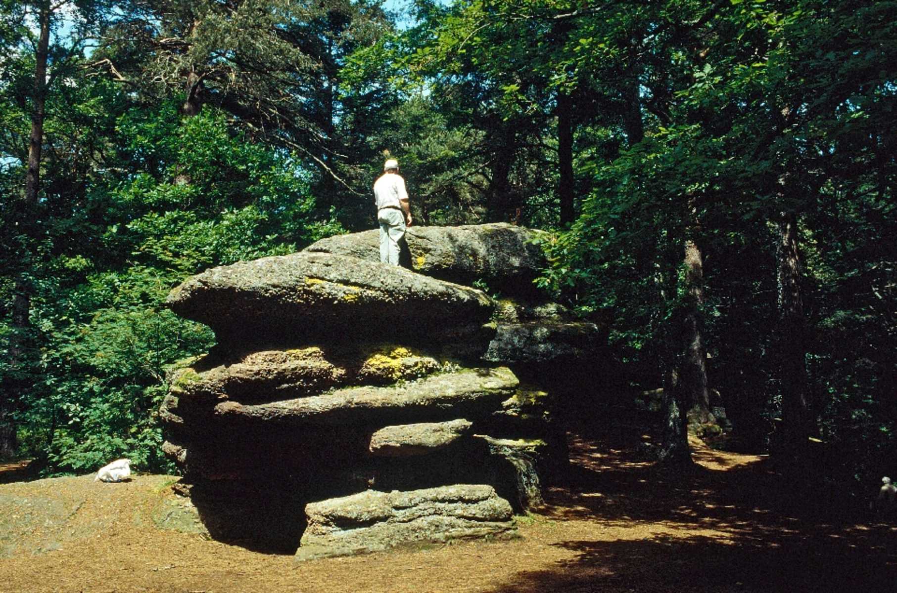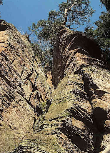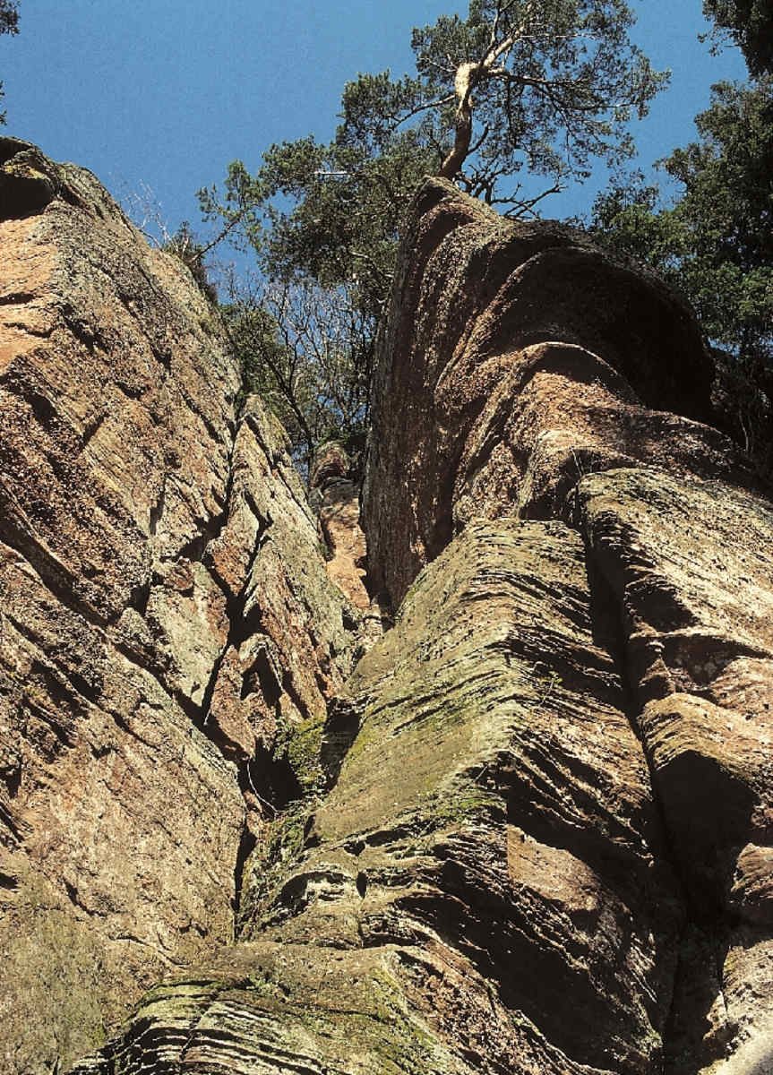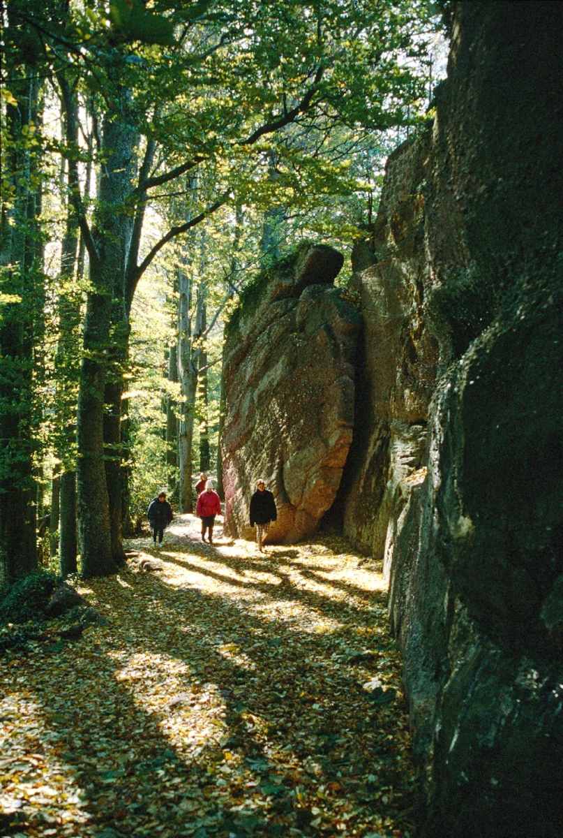 Die schönste Aussicht bietet sich vorn auf dem Gipfelfelsen. Von der Hohenbourg senkt sich der Pfad links hinab und trifft auf den mit dem blauen X markierten Sentier des Merveilles/ Wunderpfad. Er führt aussichtsreich rechts zu den Rochers géants/ Großfelsen: gigantische Buntsandsteinpfeiler und -wände, Verwitterungsblockmeere, urwaldartig unberührt wirkender, mehrhundertjähriger Wald mit Tannen und Stechpalmen.