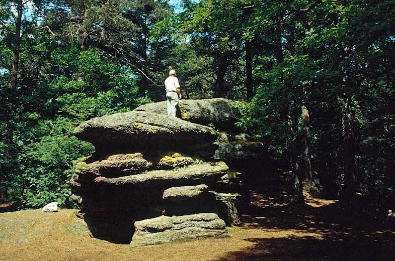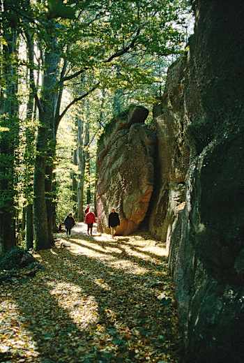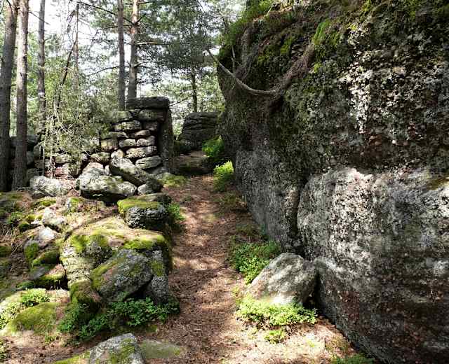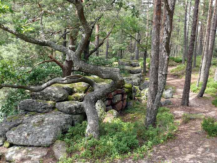 Nach der Durchquerung dieses Durchlasses beim Felskopf Chapelle des Roches/ Odilias Waldrast folgt der Rundweg einem wurzelig-steinigen Pfad längs der Heidenmauer zum aussichtsreichen Rocher du Panorama/ Hangenstein/ Mündelfels und weiter auf einem Wurzel- und Felspfad zum aussichtsreichen Maennelstein mit Panorama-Orientierungstafel und Schutzhütte.