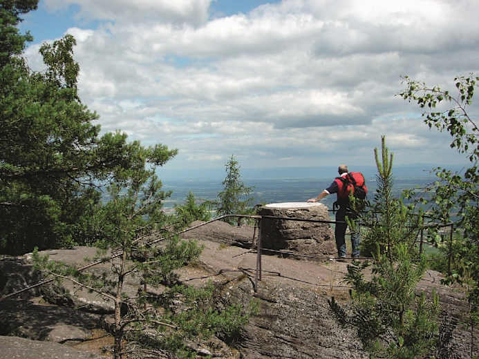 Wanderung entlang der Felsen, Burgen und Aussichtskanzeln am Heidenmauer-Rundweg im Elsass in Frankreich: Wurzel- und Felspfade folgen der jahrtausendealten Heidenmauer an der Abbruchkante des Odilienbergs mit hervorragenden Ausblicken auf die Vogesen, das Elsass, den Schwarzwald und bei klarer Sicht bis zu den Alpen.