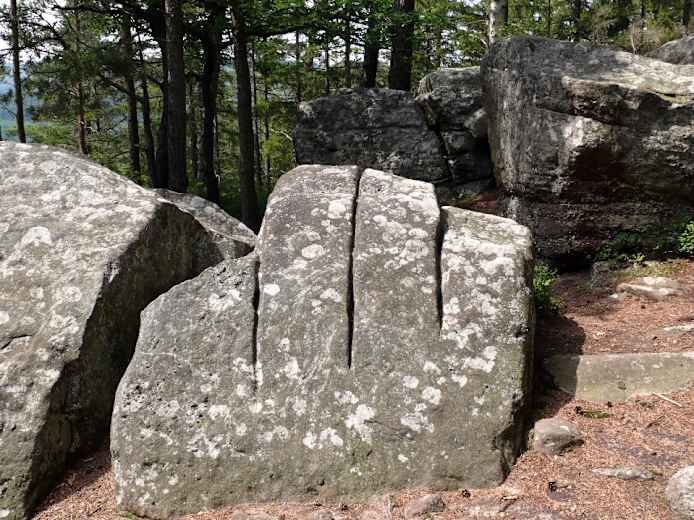 Wenig später taucht wieder die Heidenmauer-Rundweg-Markierung gelbes X auf: Sie folgt der Heidenmauer im Wald zur Grotte d’Etichon (benannt nach dem Vater der Klostergründerin) und zur Wegeverzweigung am Stollhafen-Felsen beim überhängenden Rocher d’Oberkirch/ Saufelsen mit der prähistorischen Felszeichnung eines Wildschweins an der Spitze des größeren Überhangs.