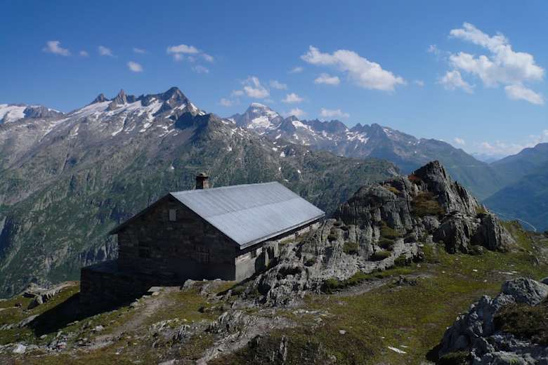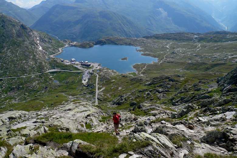 Auf der Passhöhe zweigt beim großen Parkplatz die Kraftwerksstraße zum Oberaarsee nach Westen ab. Man folgt dieser nur etwa 500 m weit bis kurz vor eine Seilbahnstation für den Kraftwerksbetrieb. Ein Wegweiser zeigt den Steig an, der im Zickzack-Kurs zwischen den rundgeschliffenen Granithöckern – einer alpinen Spielwiese nicht nur für Kinder – auf den Rücken zur Husegghütte (geschlossen) führt.