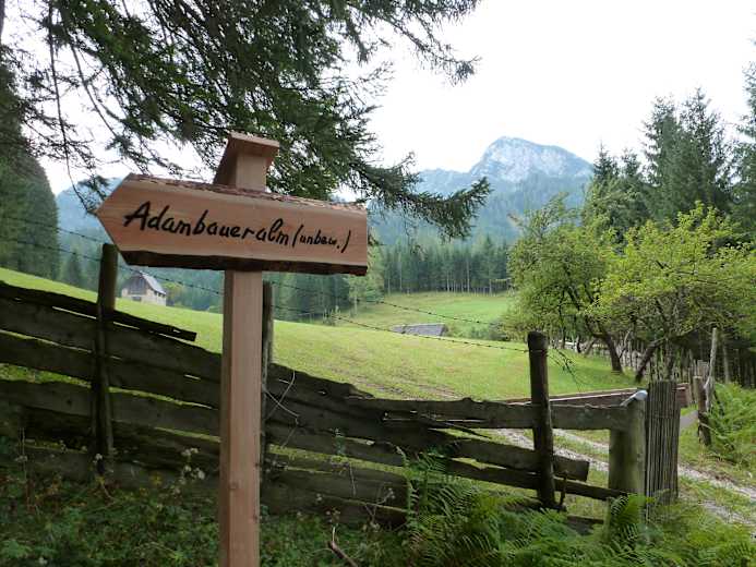 Startend beim Gasthaus Zum Krug wandert man zum Wegweiser und geht dann rechts in Richtung Buchberg oder Goss weiter. 250 m später zweigt man über eine Holzbrücke auf eine Schotterstrasse ab; diese führt direkt neben dem Bach in die entgegengesetzte Richtung. Bevor die Schotterstrasse auf eine Wiese führt, zweigt der Weg nach links ab und weiter geht es der Forststrasse entlang. Man kommt in eine Höhe von rund 1.020 m, dort biegt man dann scharf links ab, auf einen steilen Schotterweg. Von dort aus geht es dann steil bis zur Adambaueralm hinauf. Die Adambaueralm bietet keine Einkehrmöglichkeit.
