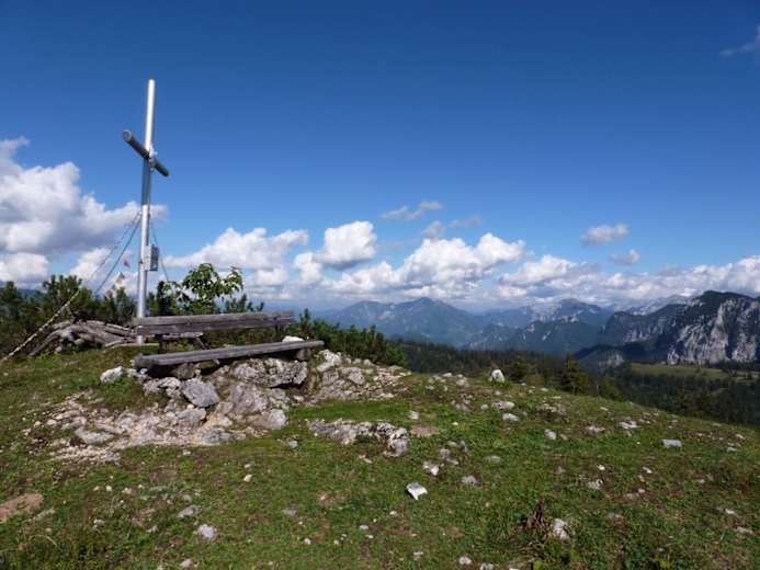 Vom Gipfel bietet sich ein traumhafter Blick über die Almen, auf den Gebirgsstock der Kalten Mauer bis hinein ins Gesäuse. Einkehrmöglichkeit gibt es im Gasthaus Zum Krug.
