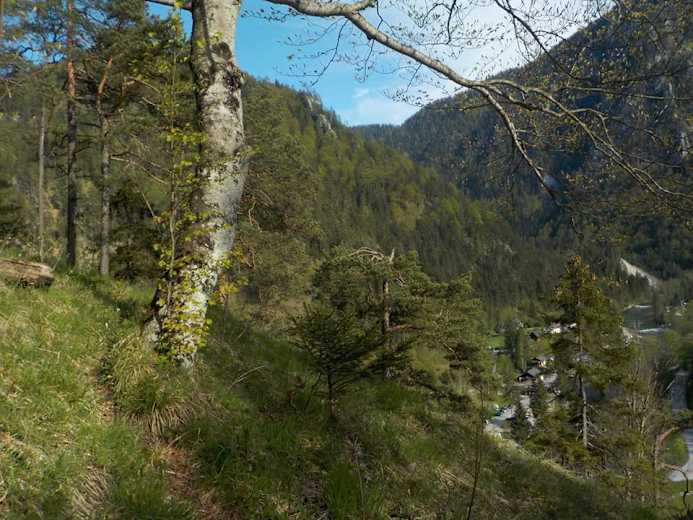 Die Jausenstation ist zugleich Umkehrpunkt dieser Route und ein Teilstück führt eben gleich retour. Man hält sich nun auf der Asphaltstraße rechts, bis man zu einer Kapelle kommt. Dort zweigt der Weg in die Wiese ab und führt geradeaus weiter. Später trifft man wieder auf Wald und einige anstrengende Höhenmeter sind zu machen. Der alpine Steig zieht nach links weiter und behält immer die gleiche Richtung bei, er quert den wiesigen, steilen Hang. Zuletzt ändert der Weg die Richtung, es geht noch einmal hinauf auf den Häuselkogel. Dort gibt es einen wunderbaren Ausblick über Wildalpen.