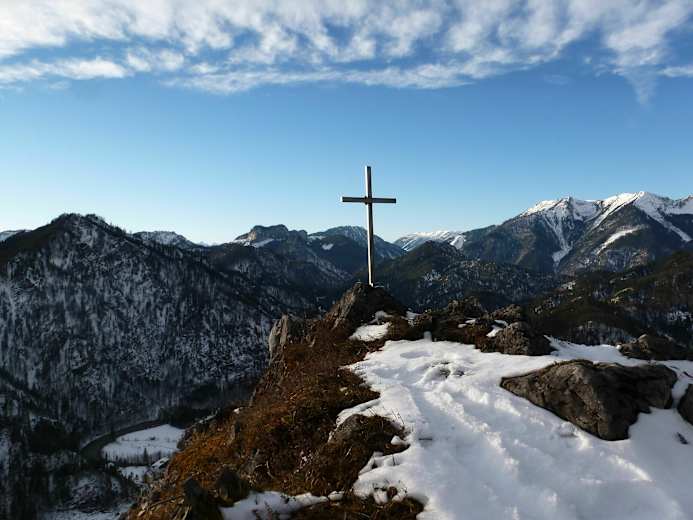 Das große Plateau am Gipfelkreuz lädt zu einer wohlverdienten Rast ein. Der wunderbare Ausblick auf die Riegerin, den Hochstadl, den Großen Geiger und das Hochkar ist bei Sonnenschein ein herrliches Erlebnis und entschädigt für die Mühe.