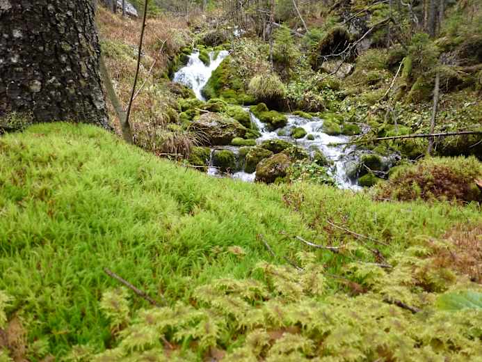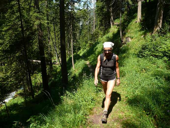 Bei der Pension Kollnegg biegt man dann an der Kreuzung ab und folgt der Straße in Richtung Rauchmauer auf Asphalt, bis man wieder ein alpines Steiglein erreicht. Weiter geht es durch den Wald bergab bis zum Säusenbach und zur Straßenkreuzung Einfahrt Hinterwildalpen.