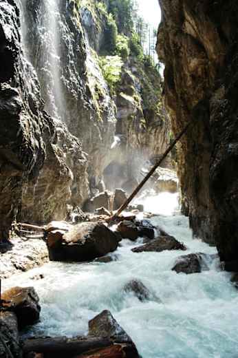 Ab hier geht die Route stets entlang der Partnach, die man über Stege, durch Tunnel und Galerien, immer gut gesichert passieren kann. Belohnt wird man mit einer beeindruckenden Aussicht in die tiefe Klamm sowie auch hinauf nach oben, wo man ein Naturschauspiel des Wassers und der Sonnenstrahlen beobachten kann.