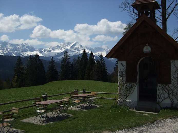 Ein atemberaubender Ausblick auf Wamberg bietet die Pfeiffer-Alm. Es ist das höchstgelegene Kirchdorf Deutschlands.