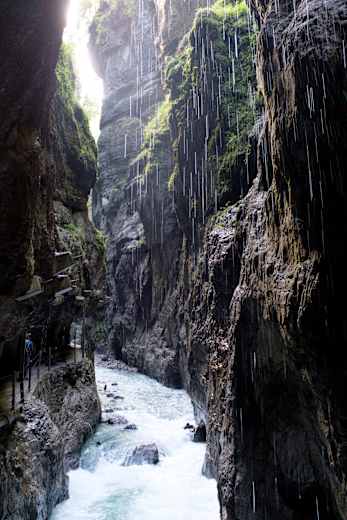 Die Wanderung durch die wilde Klamm ist höchst beeindruckend. Auf nur 800 m Länge hat sich die Partnach hier rund 80 m tief in den Felsen gegraben. Das Wasser hat bizarre Felsformationen geschaffen, rauscht über Wasserfälle und Stromschnellen und dreht sich in tiefblauen Gumpen. Die Klamm ist eines der schönsten Naturwunder im bayerischen Alpenraum.