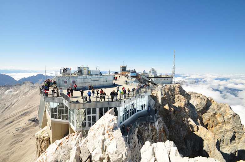 Über die weiten Geröllfelder des Zugspitzplatts geht es im Anschluss weiter bis zum SonnAlpin und zur Zugspitzbahn auf 2.600 m. Auf einem gut abgesicherten Steig entlang der Reste des Gletschers geht es steil aufwärts auf den Zugspitzgipfel, auf dem das Münchner Haus auf 2.964 m thront.