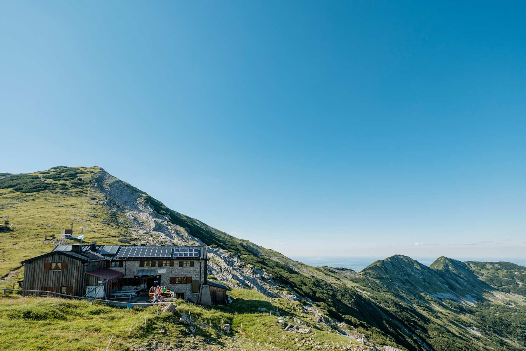 Knapp unter dem Gipfel des Oberen Rißkopfs liegt im Estergebirge die Weilheimer Hütte auf 1.946 m Höhe. Foto: Hans Herbig, Bergwelten 02/2018
