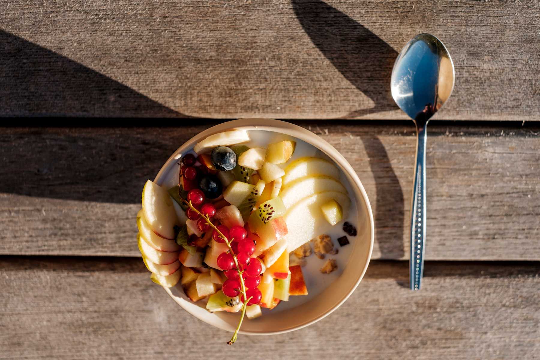 Auch für den süßen Nachtisch ist gesorgt: Joghurt mit Früchten. Foto: Hans Herbig, Bergwelten 02/2018