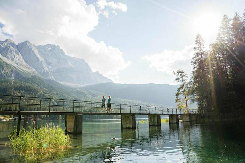 Wenn man beim Ostufer ankommt erreicht man bald eine kleine Brücke. Hier muss man weiter am Nordufer entlangwandern, um eine herrliche Aussicht auf die Zugspitze zu erleben. Die Tour führt einmal um den ganzen See und man gelangt automatisch wieder zum Ausgangspunkt zurück.