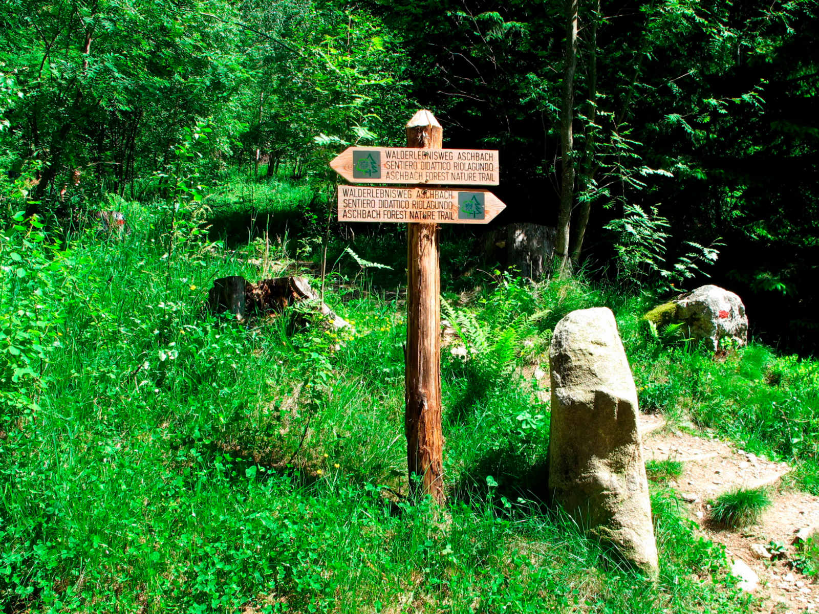 Auf dem Walderlebnispfad Aschbach im Meraner Land (Südtirol) gibt es für Wanderer vielfältige Einblicke in das Ökosystem Wald und in die Tier- und Pflanzenwelt. Unterwegs in den Ortler-Alpen wird auf spielerische und erlebnisorientierte Art das Thema Wald und Holz vermittelt. Der Walderlebnisweg ist ein Rundwanderweg mit traumhafter Aussicht auf den Naturpark Texelgruppe und besonders auch für Familien mit Kindern geeignet.