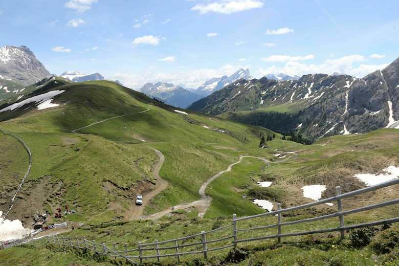 Von Wolkenstein aus fährt man mit dem Auto bis zum Sellajoch. Vom Sellajochhaus aus geht es in südlicher Richtung über Grashügel zur Rodellascharte. Ab hier bergab der Markierung 529 über schroffes Gelände und später Almen und Wälder folgen. Über zwei Bergrücken geht es weiter südlich bis etwas überhalb von Campitello. Bei Fossel biegt der Weg nach rechts ab und endet in einer Fahrtstraße, die jedoch für den Verkehr gesperrt ist. Auf 1.679 m zweigt der Weg zur Sandro Pertini Hütte ab, der über Almwiesen bis zu der Schutzhütte führt. Zurück auf die Rodellascharte geht es über den Friedrich-August-Weg und herab zum Sellajochhaus.
