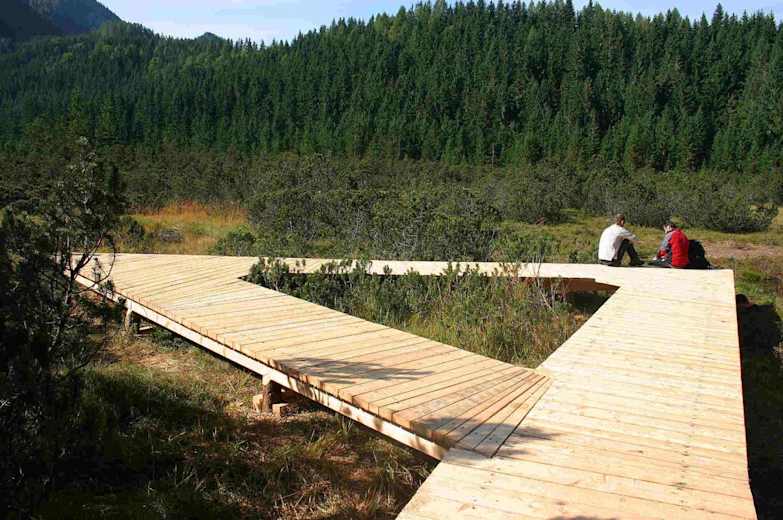 Vom dort führt rechts eine Schotterstraße zum Waldrand, an einem Weidegatter biegt man dann links ab und gelangt am Waldsaumpfad entlang zum Bauernhof Hochtal. Unweit vom Gehöft Hochtal befindet sich rechts das Hochmoor, das man rechtshaltend umrundet (Dauer: rund 45 Minuten). Danach geht man auf der Asphaltstraße am Bauernhof Hochtal vorbei bis zu einer Senke. Nach der Brücke führt der Rückweg leicht bergauf, links weiter und von dort nach rechts zum Anwesen Ablass.
