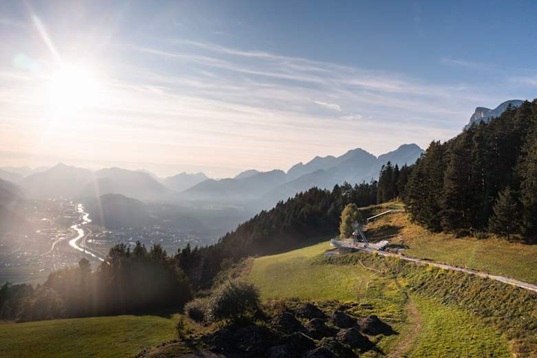 Anschließend stellt man sich nach einer Runde um den See an Station vier „Enge und Ängsten“, denn statt zurück auf den Albert-Dürer-Weg zu wandern, nimmt man hier die Route rechts runter. Auf dem Broch-Weg geht es dann weiter talwärts zur fünften Station, die mit „Weitblick und Verantwortung“ ins Inntal blickt. Bei der Möserer Kirche zu Mariä Heimsuchung erreicht man die vorletzte Station, ruft sich dort „Werte und Familie“ in Erinnerung und schlendert schließlich eine Abschlussschleife zur letzten Station - und den „lebendigen Friedensschwingungen“ der Möserer Friedensglocke.