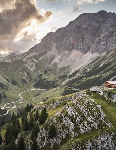 Absteigen kann man entweder über den gleichen Weg oder über die Wangalm und Wettersteinhütte. Wer sich für letzteres entscheidet, folgt dem Weg ab dem Scharnitzjoch Richtung Wangalm und steigt über saftige Almwiesen und Kuhweiden ab. Die beiden Almen liegen nur 10 Minuten voneinander entfernt und bieten beide herrliche Sonnenterassen, urige Stuben, sehr gute Kulinarik und herzliche Gastfreundschaft. Von hier aus kann man bis ins Gaistal absteigen.
